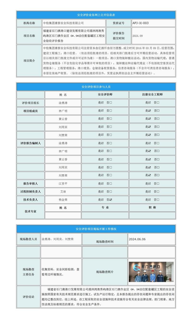 福建省石门澳港口建设发展有限公司湄洲湾港秀屿港区石门澳作业区 6#、9#泊位配套罐区工程安全验收评价报告