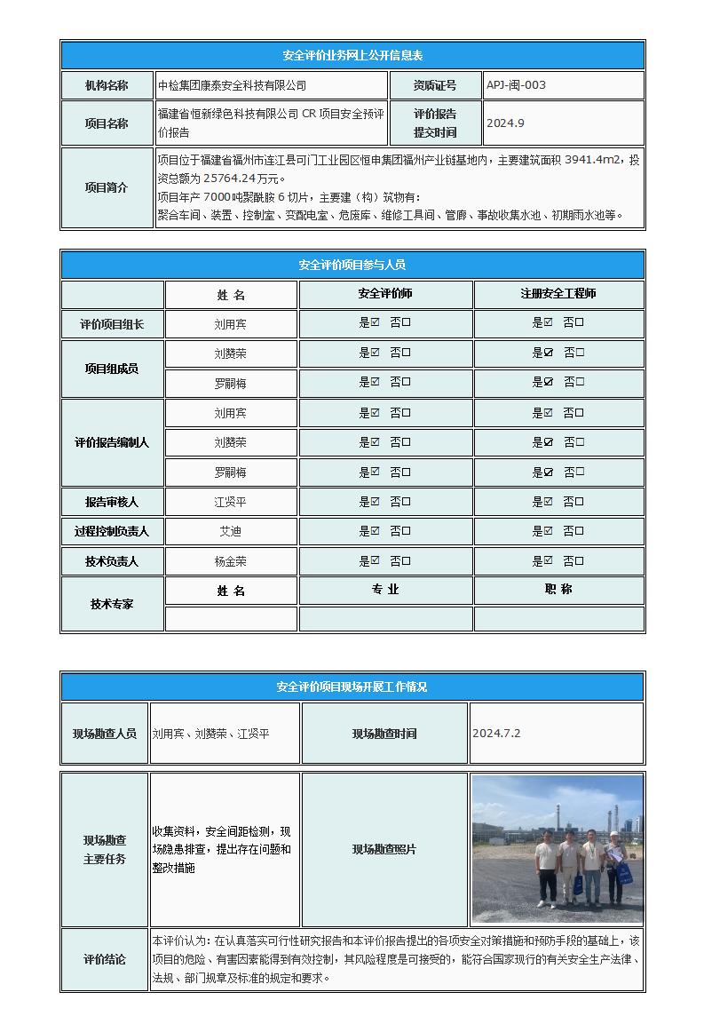 福建省恒新绿色科技有限公司CR项目安全预评价报告
