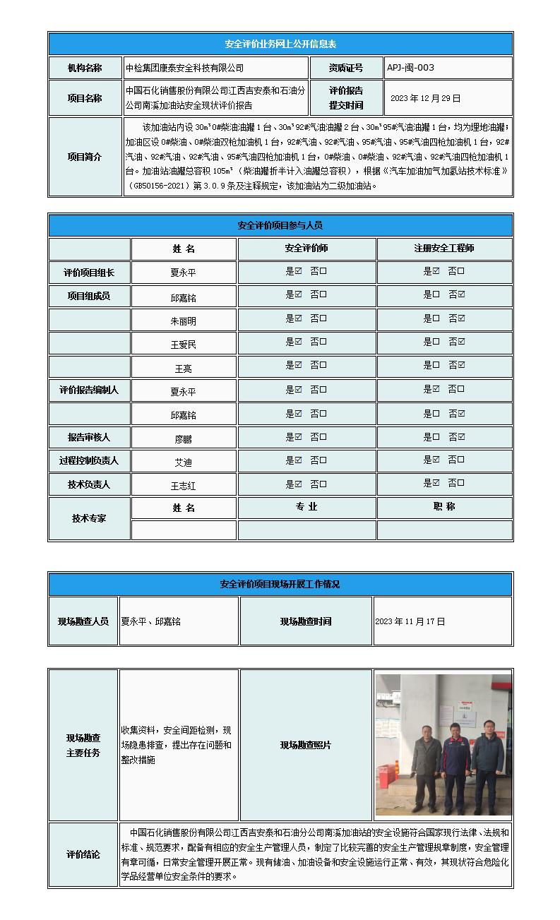 中国石化销售股份有限公司江西吉安泰和石油分公司南溪加油站安全现状评价报告