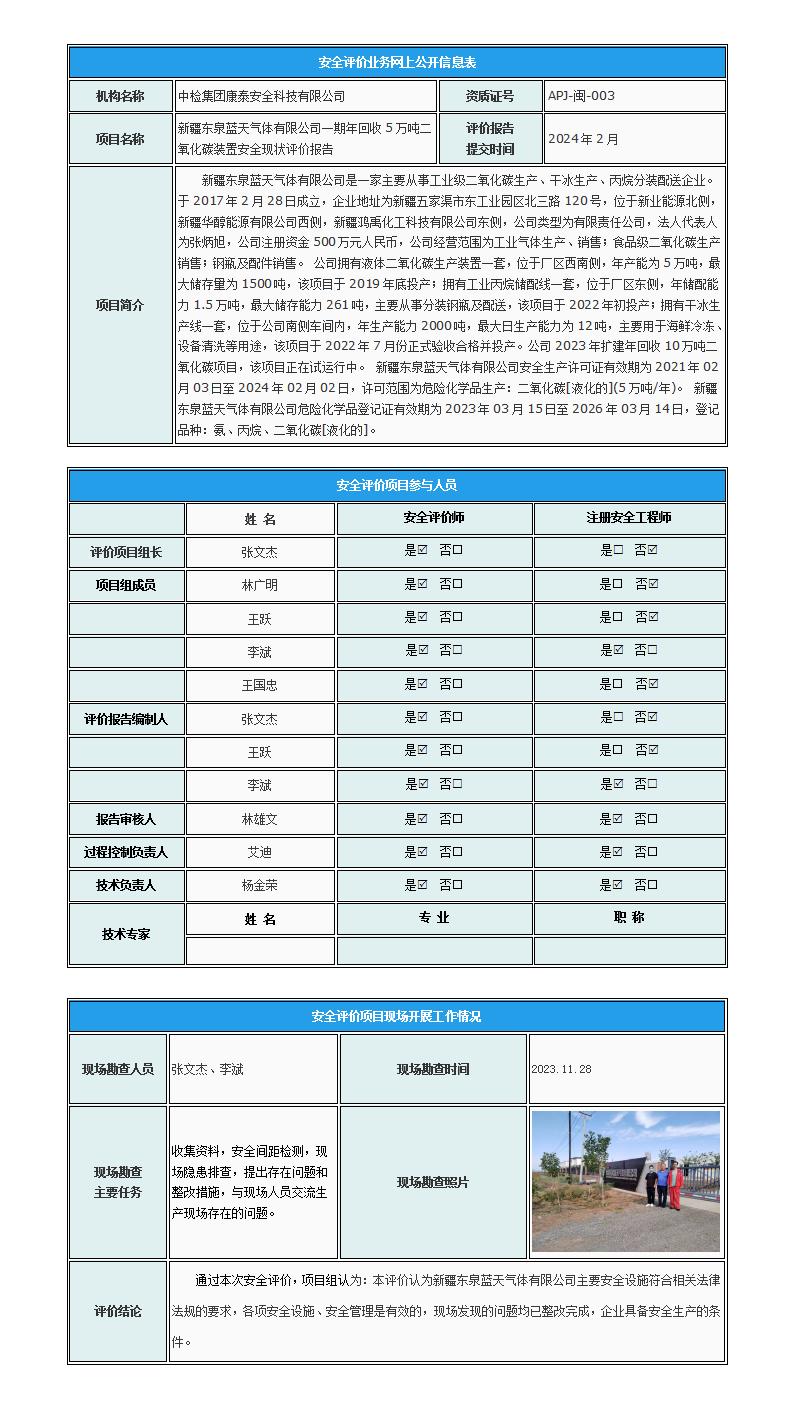 新疆东泉蓝天气体有限公司一期年回收5万吨二氧化碳装置安全现状评价报告