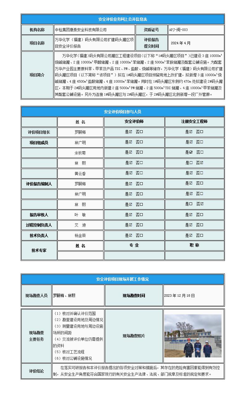 万华化学(福建)码头有限公司扩建码头罐区项目安全评价报告