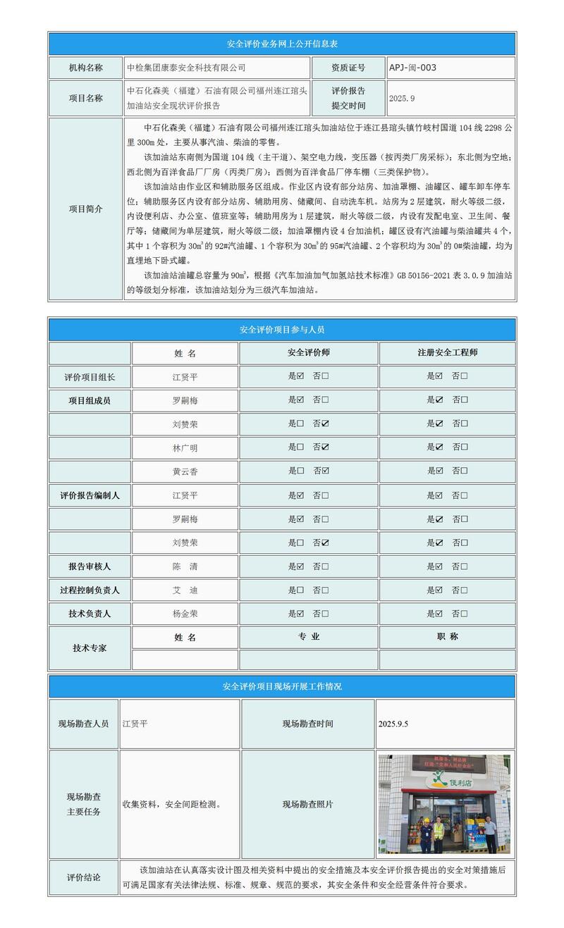 中石化森美(福建)石油有限公司福州连江琯头加油站安全现状评价报告