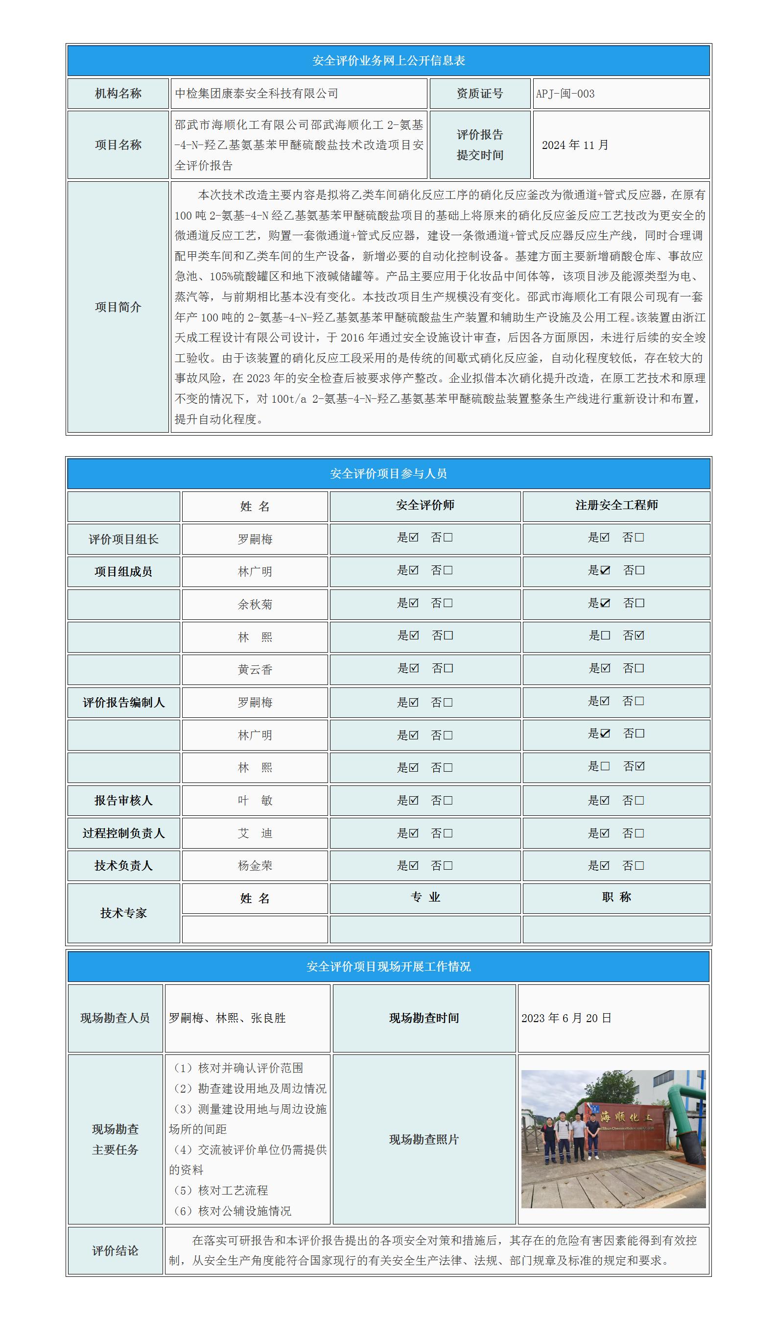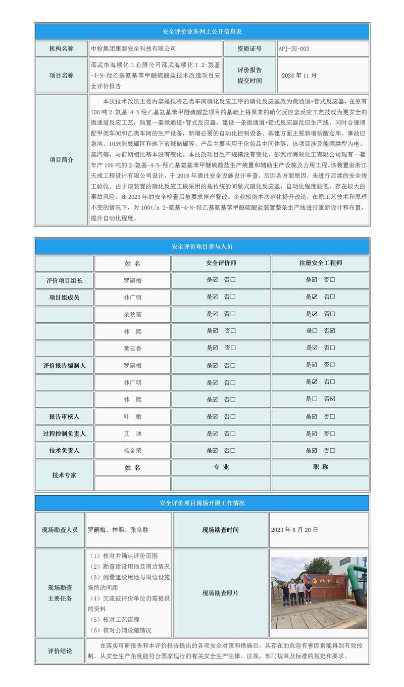 邵武市海顺化工有限公司邵武海顺化工2-氨基-4-N-羟乙基氨基苯甲醚硫酸盐技术改造项目安全评价报告