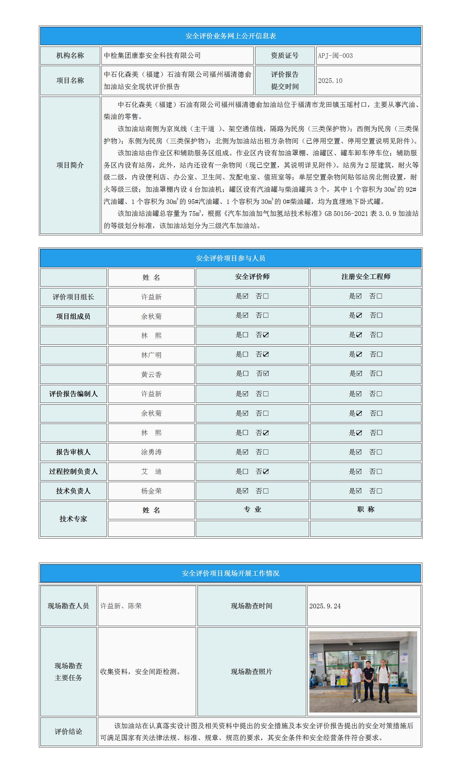 中石化森美(福建)石油有限公司福州福清德俞加油站安全现状评价报告