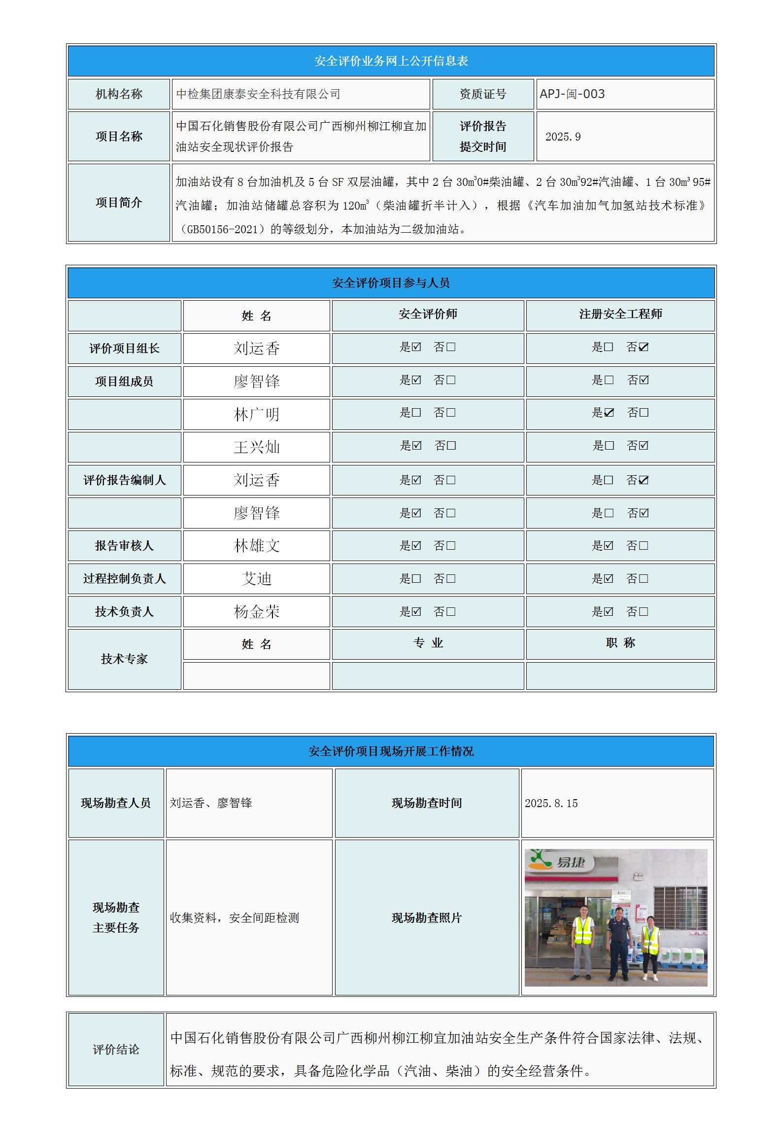 中国石化销售股份有限公司广西柳州柳江柳宜加油站安全现状评价报告