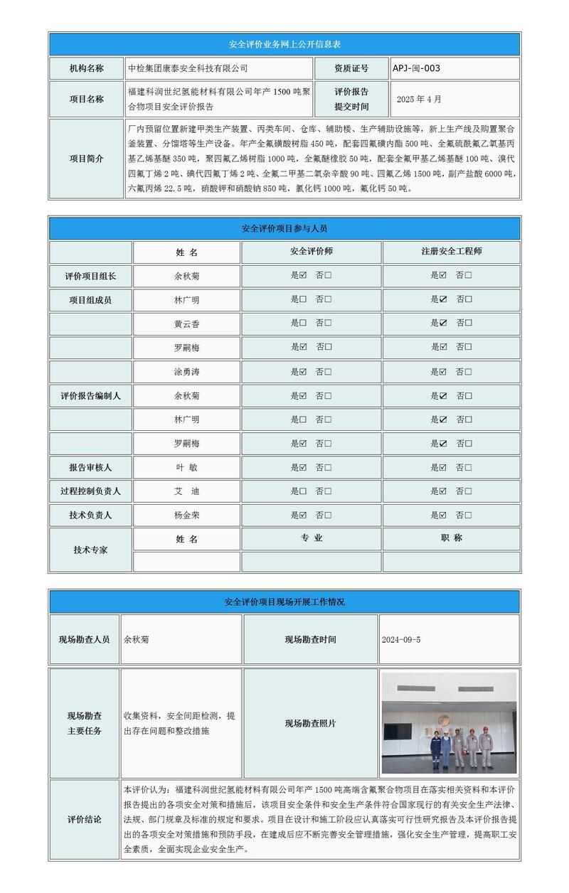 福建科润世纪氢能材料有限公司年产1500吨聚合物项目安全评价报告