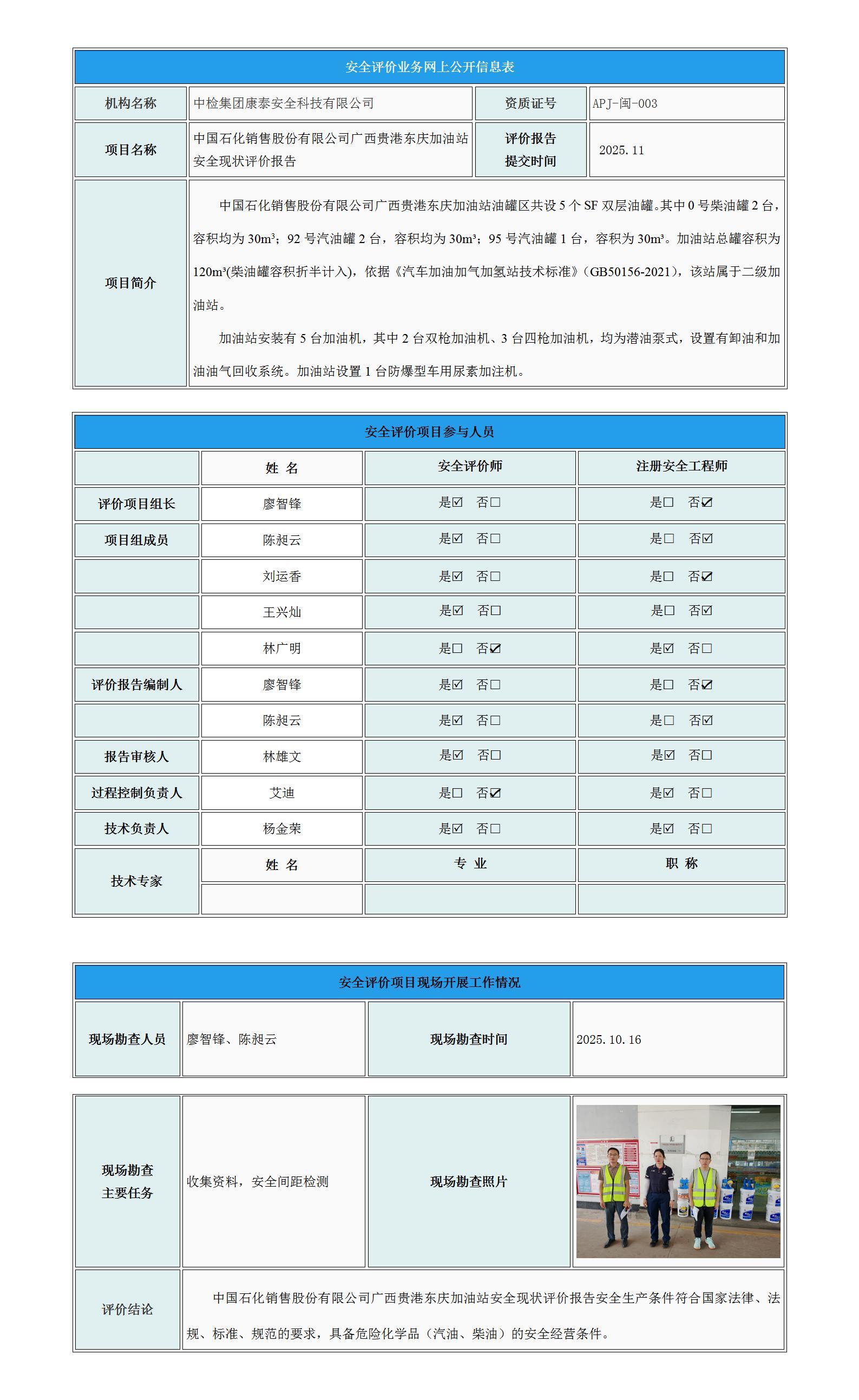 中国石化销售股份有限公司广西贵港东庆加油站安全现状评价报告