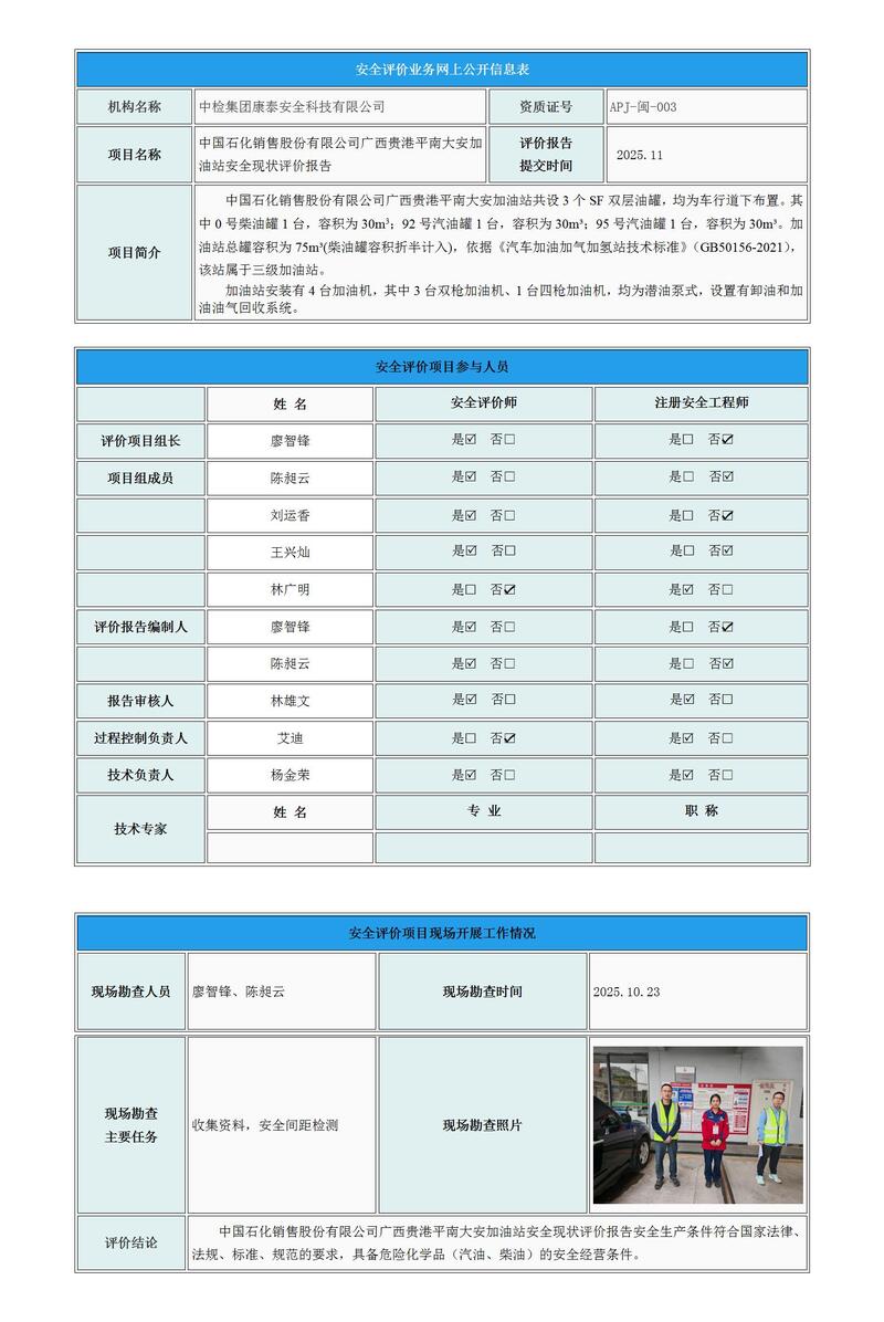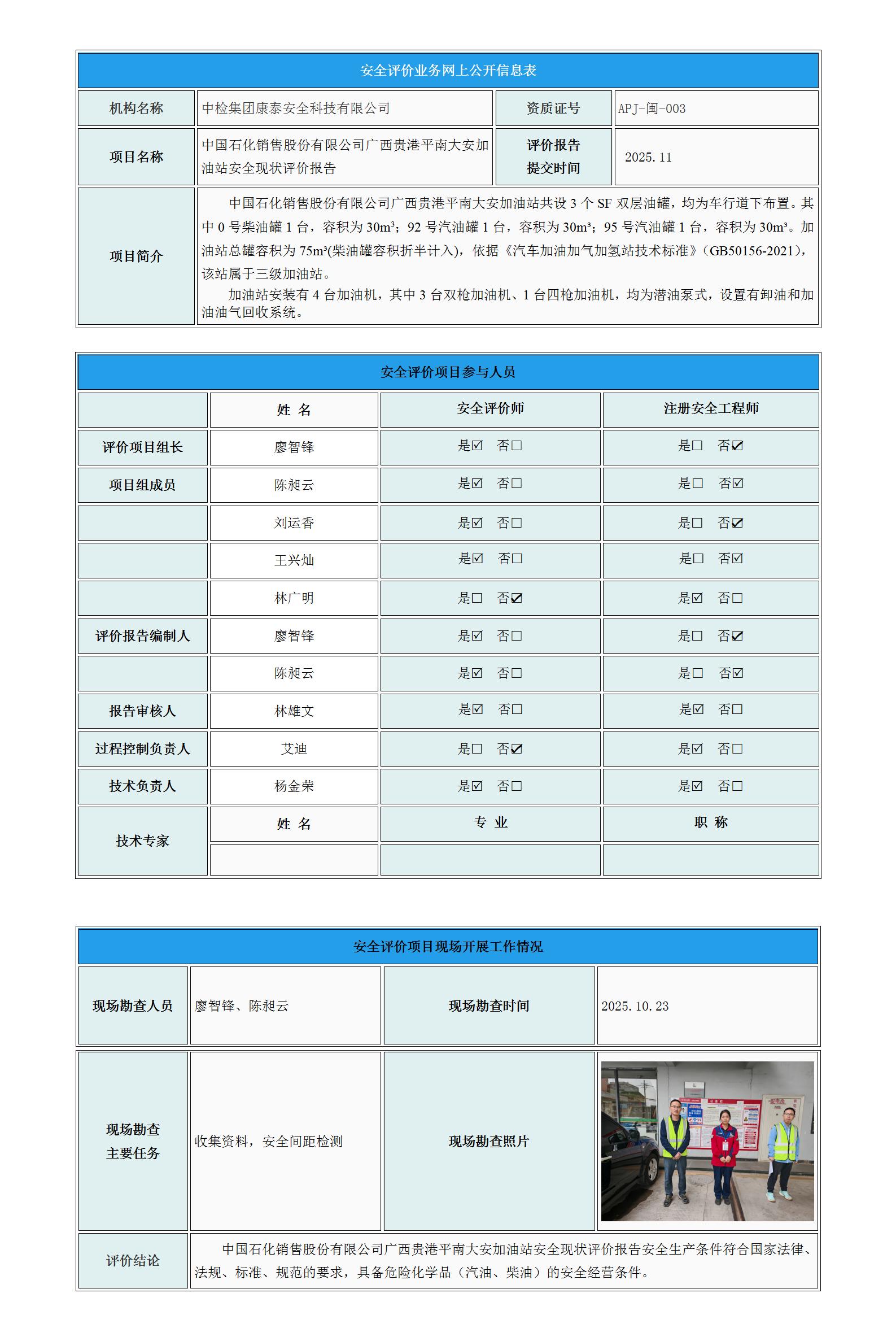 中国石化销售股份有限公司广西贵港平南大安加油站安全现状评价报告