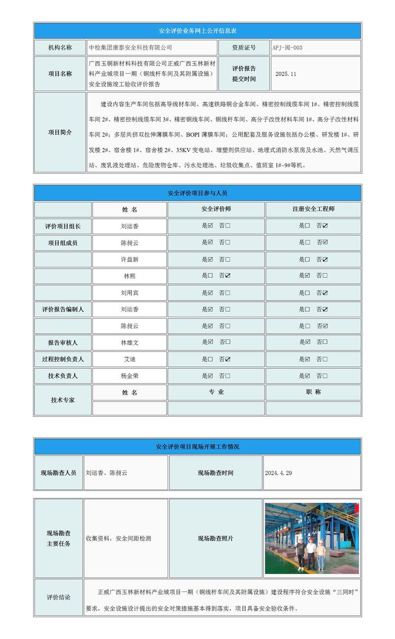 广西玉铜新材料科技有限公司正威广西玉林新材料产业城项目一期(铜线杆车间及其附属设施)安全设施竣工验收评价报告