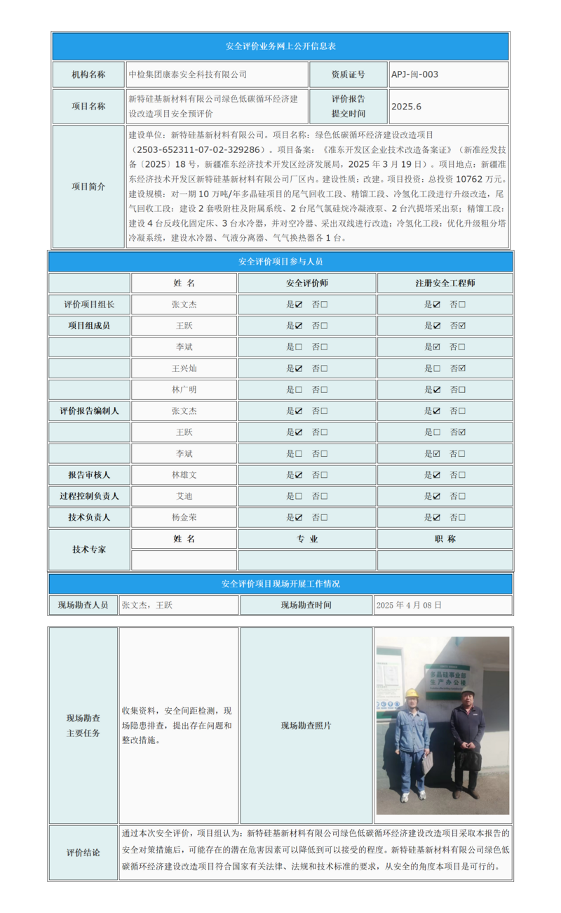 新特硅基新材料有限公司绿色低碳循环经济建设改造项目安全预评价