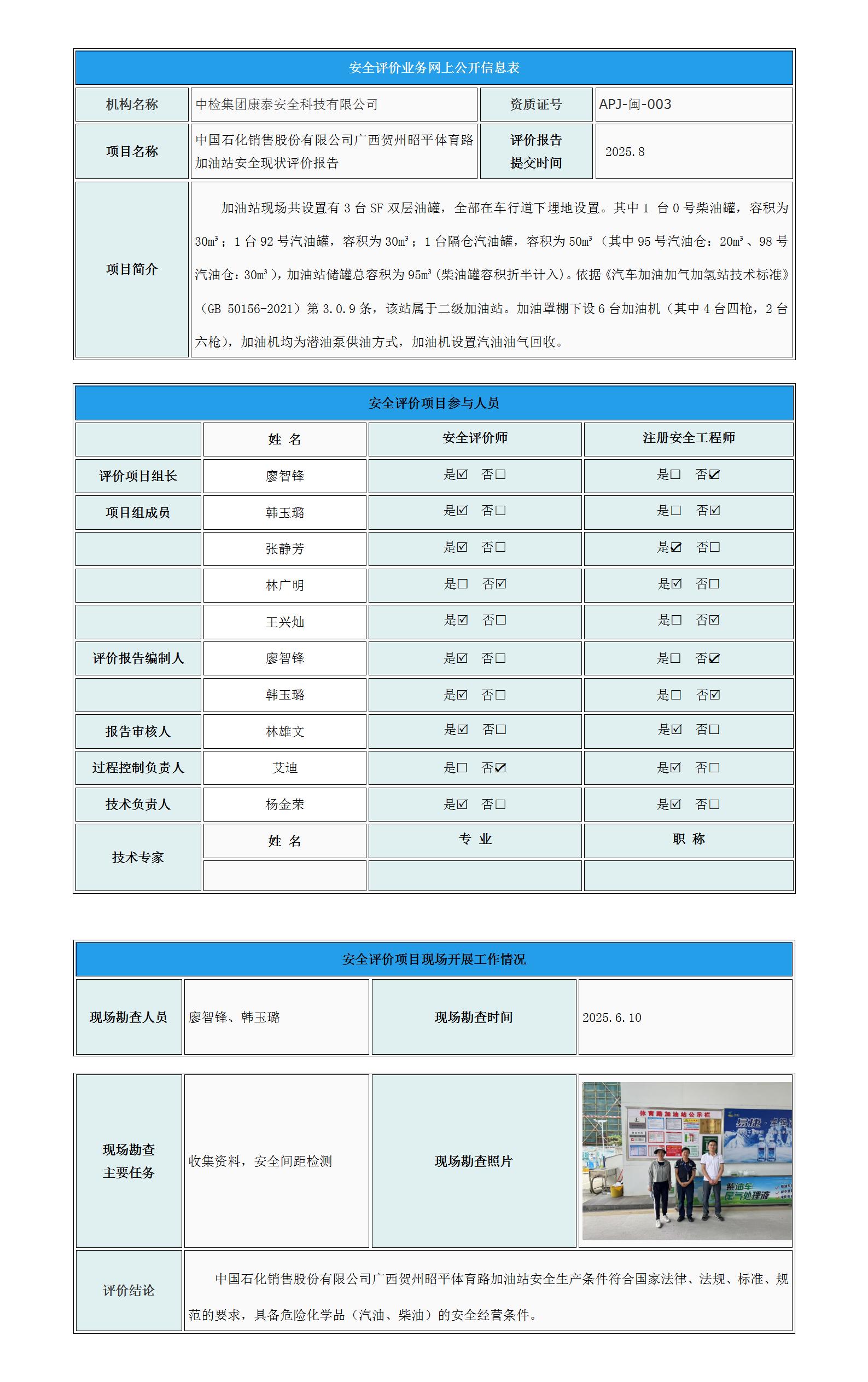 中国石化销售股份有限公司广西贺州昭平体育路加油站安全现状评价报告