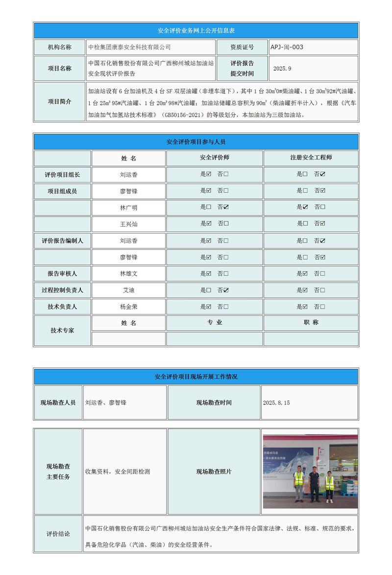 中国石化销售股份有限公司广西柳州城站加油站安全现状评价报告