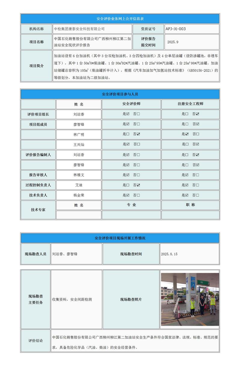 中国石化销售股份有限公司广西柳州柳江第二加油站安全现状评价报告