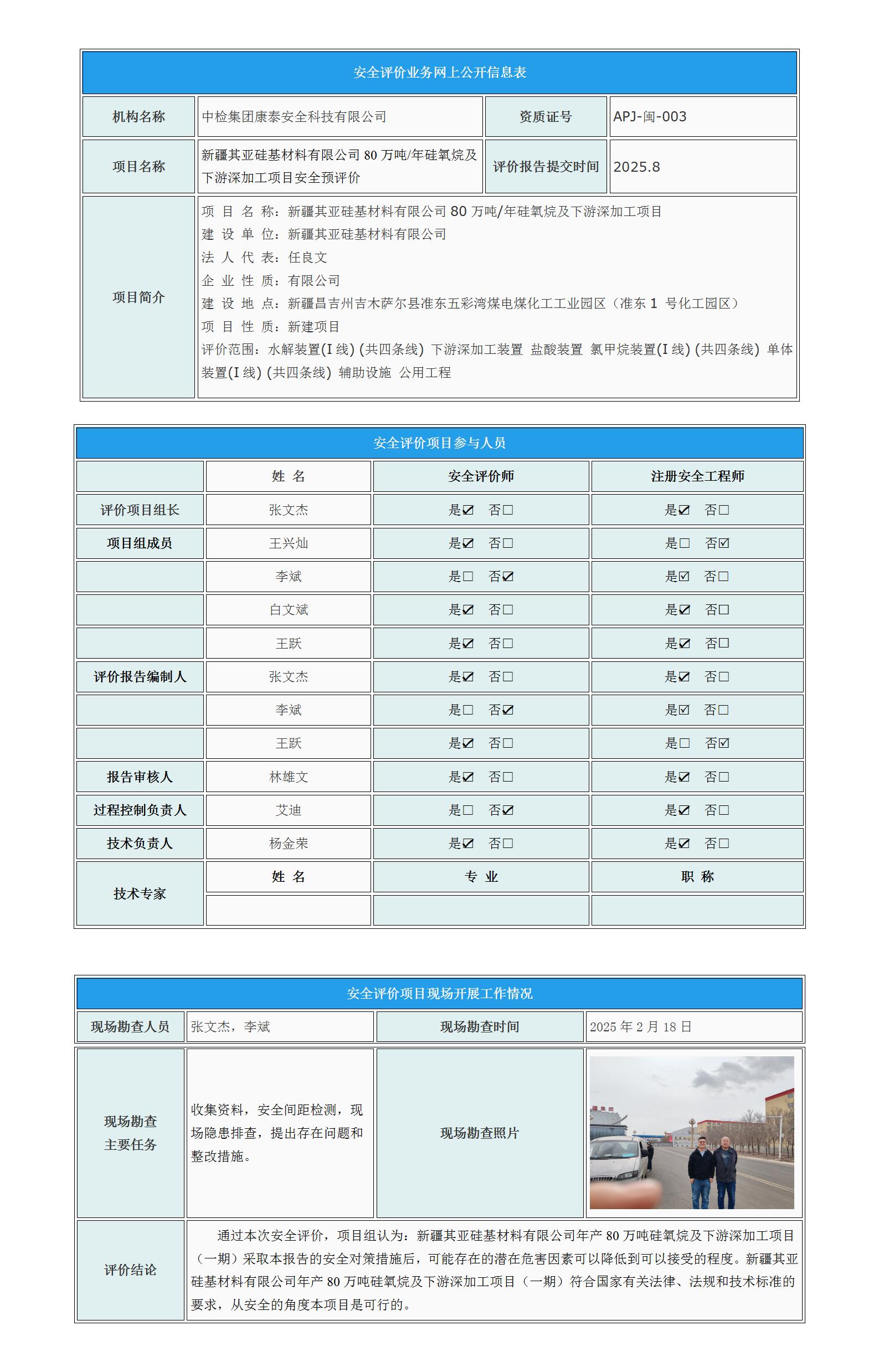 新疆其亚硅基材料有限公司80万吨/年硅氧烷及下游深加工项目安全预评价