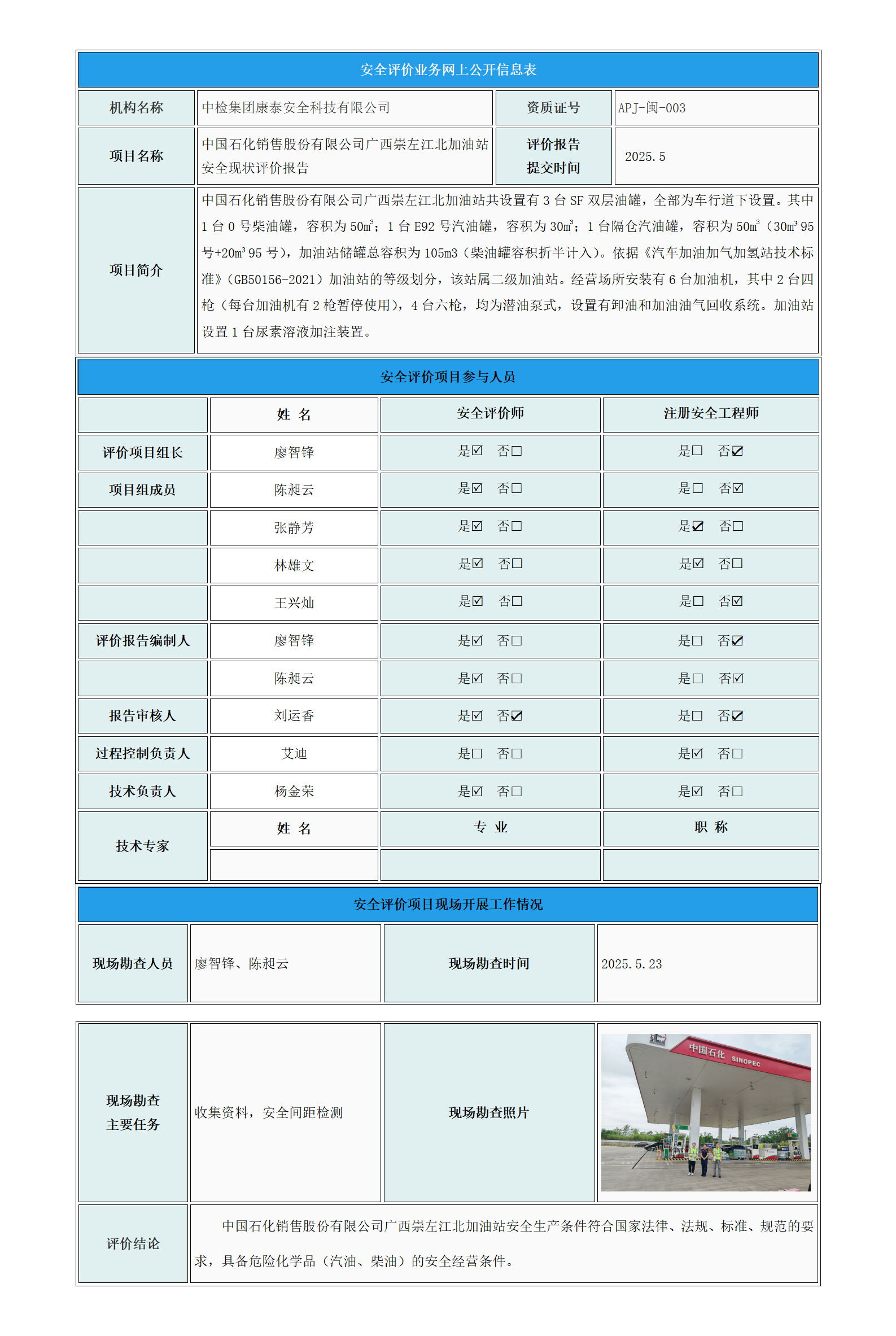 中国石化销售股份有限公司广西崇左江北加油站安全现状评价报告