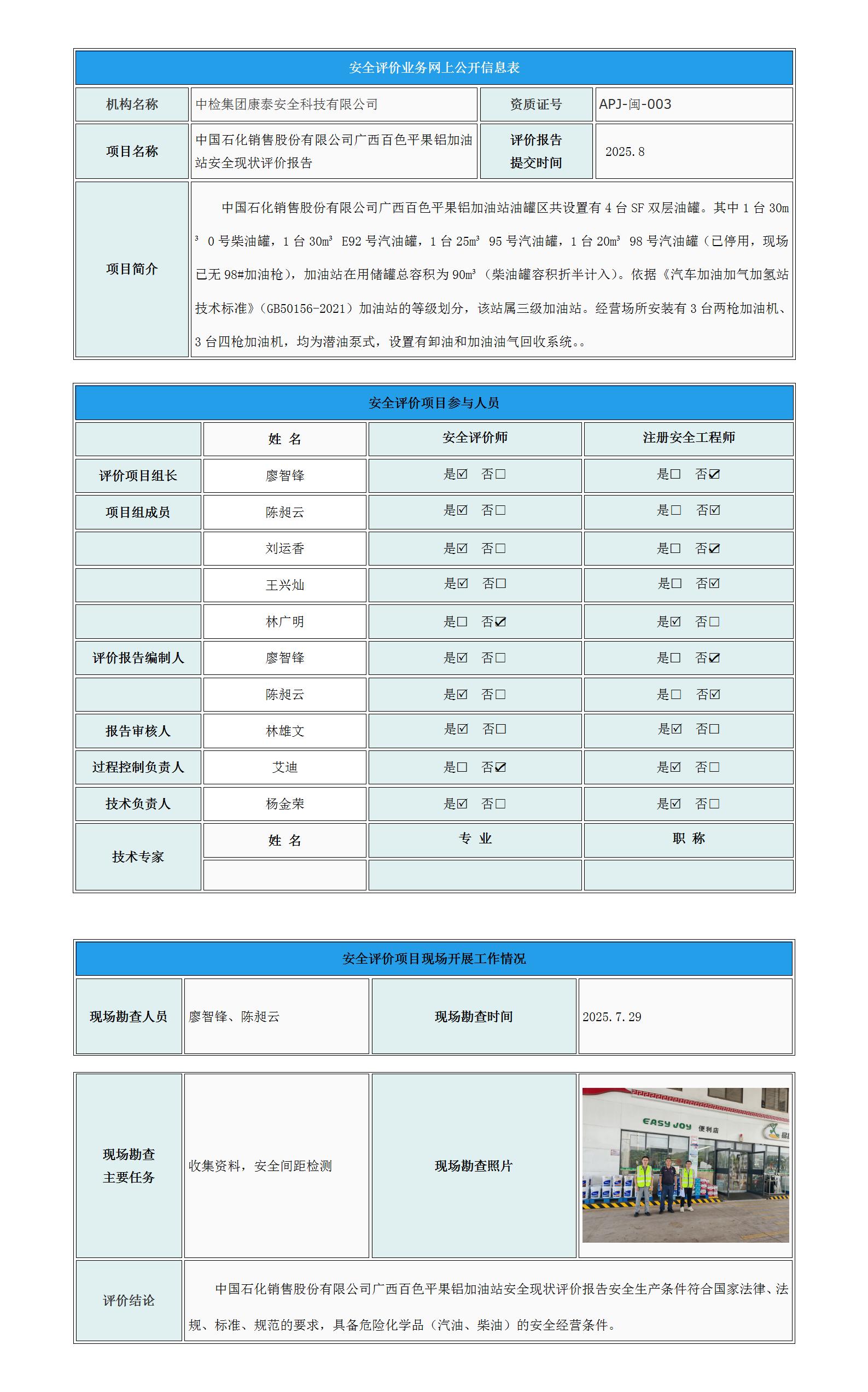 中国石化销售股份有限公司广西百色平果铝加油站安全现状评价报告