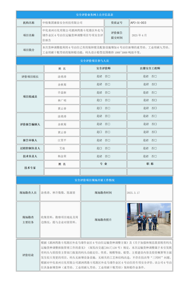 中化泉州石化有限公司湄洲湾港斗尾港区外走马埭作业区6号泊位运输货种调整项目专项安全评价报告