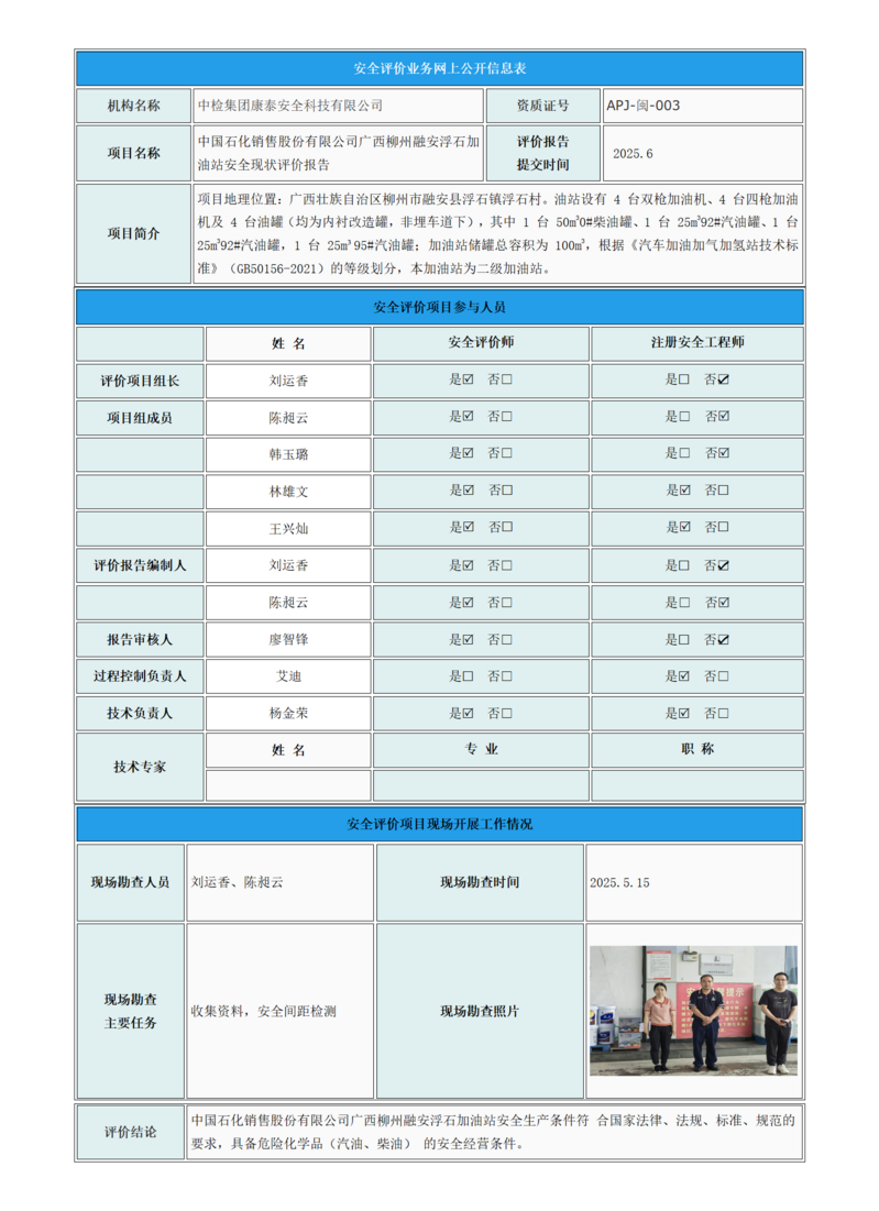 中国石化销售股份有限公司广西柳州融安浮石加油站安全现状评价报告