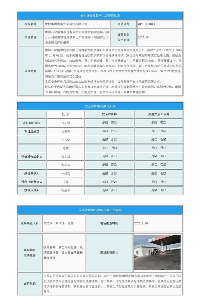 中国石化销售股份有限公司内蒙古鄂尔多斯石油分公司杭锦旗锡尼镇东出口加油站(加油部分)安全现状评价报告