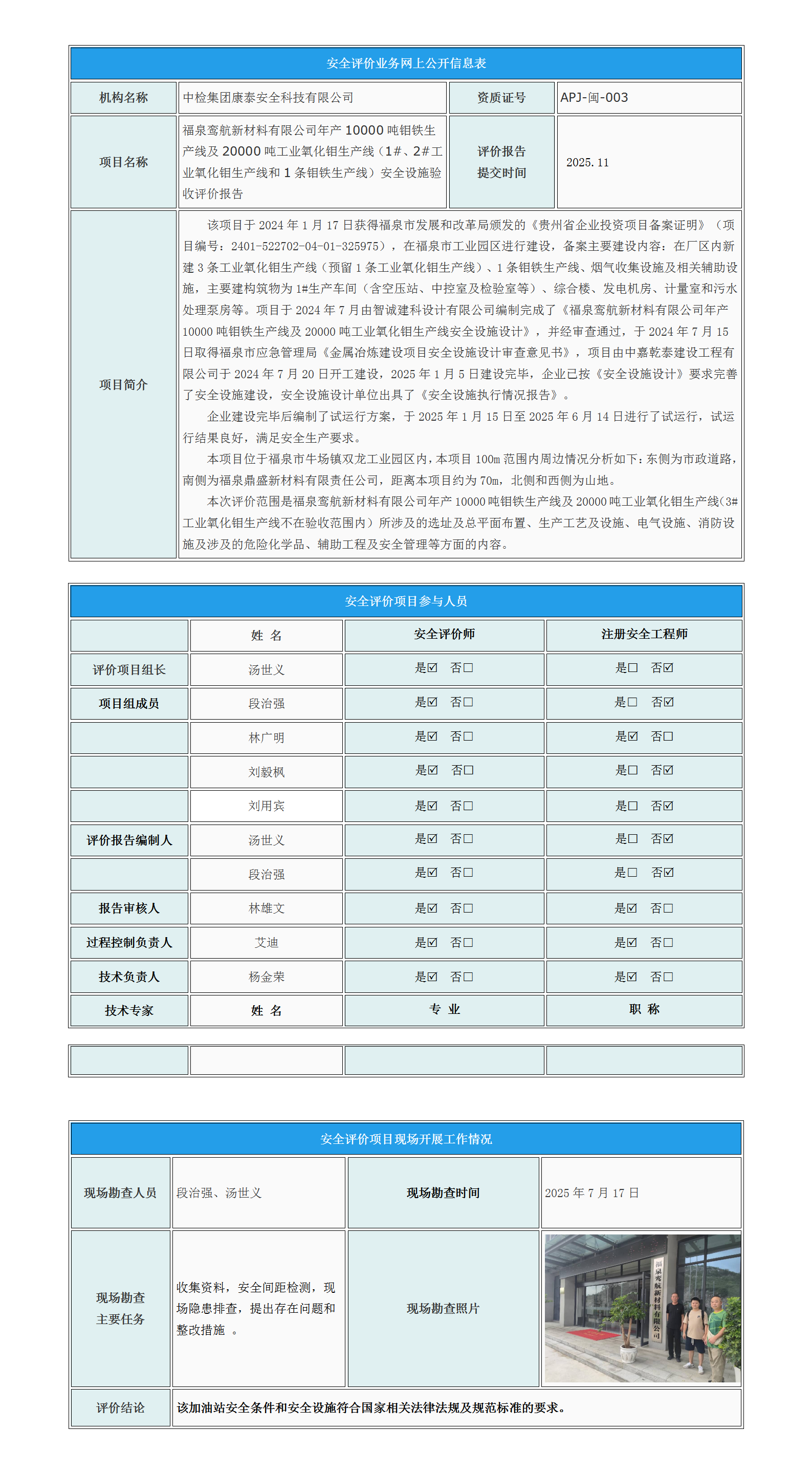 福泉鸾航新材料有限公司年产10000吨钼铁生产线及20000吨工业氧化钼生产线(1#、2#工业氧化钼生产线和1条钼铁生产线)安全设施验收评价报告