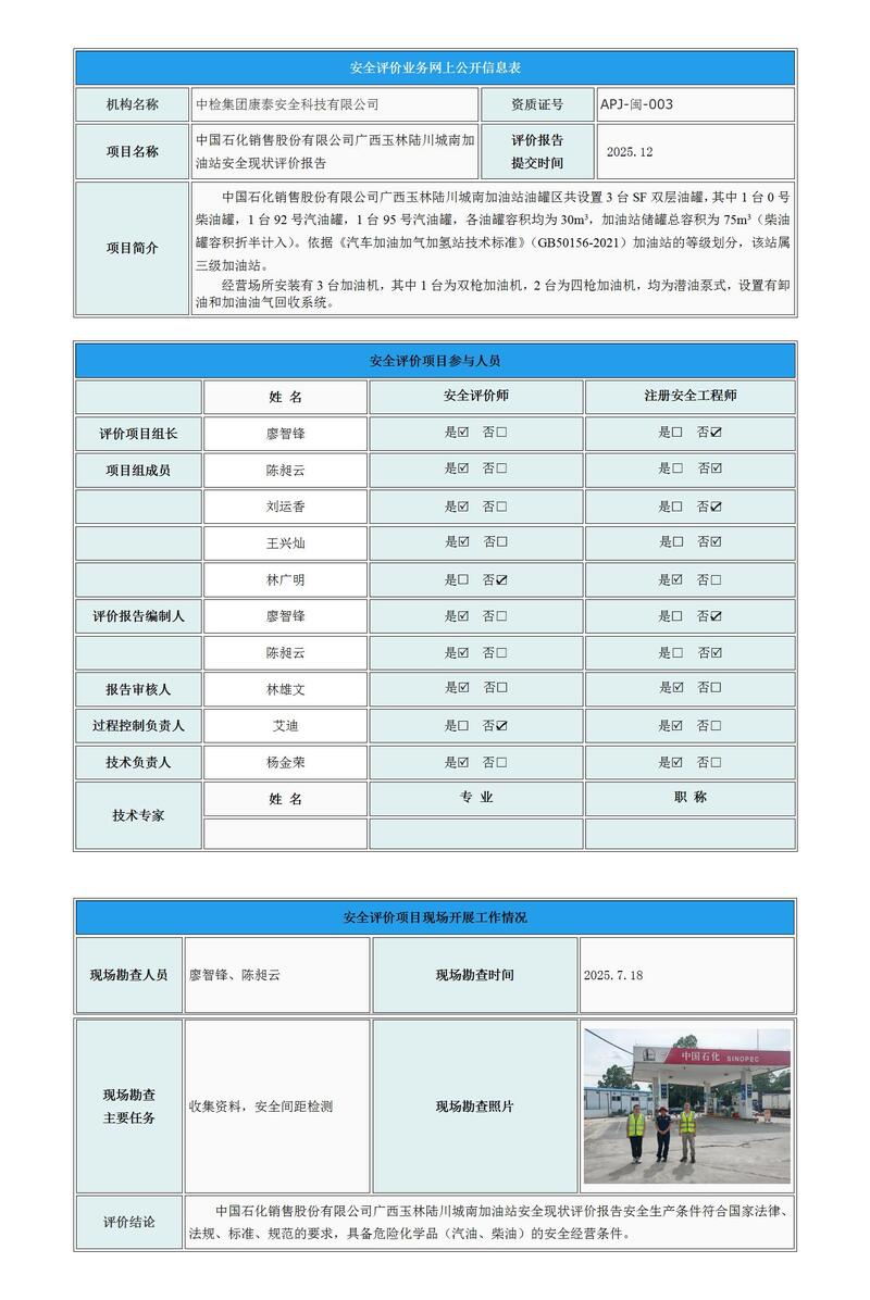 中国石化销售股份有限公司广西玉林陆川城南加油站安全现状评价报告