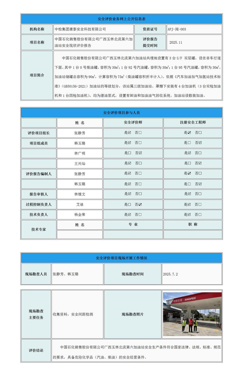 中国石化销售股份有限公司广西玉林北流六靖镇东加油站安全现状评价报告
