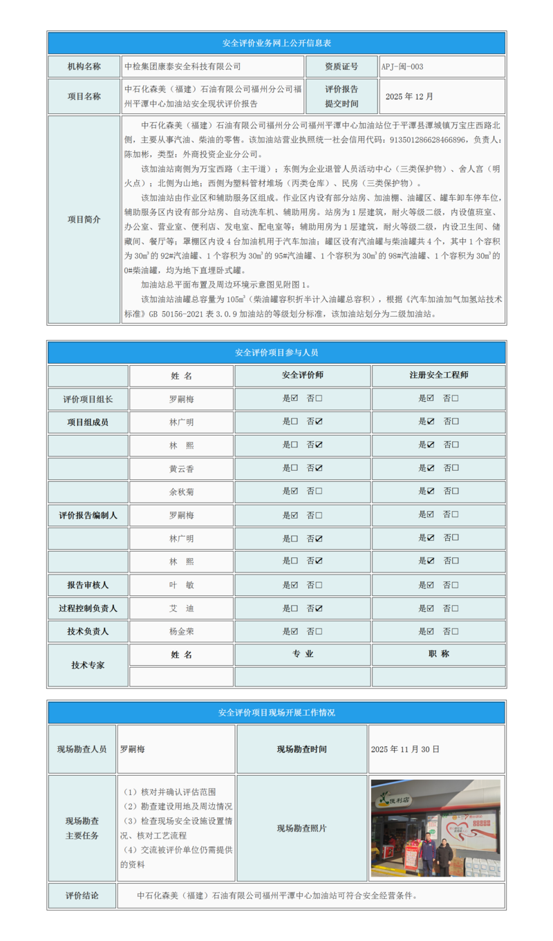 中石化森美(福建)石油有限公司福州分公司福州平潭中心加油站安全现状评价报告