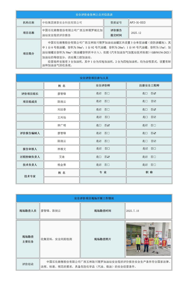 中国石化销售股份有限公司广西玉林珊罗城北加油站安全现状评价报告