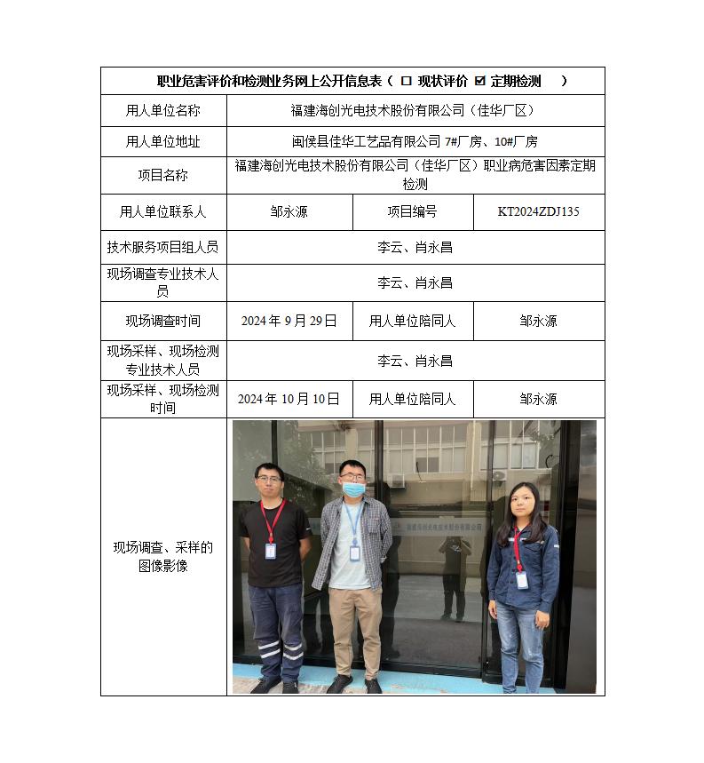 福建海创光电技术股份有限公司(佳华厂区)职业病危害因素定期检测