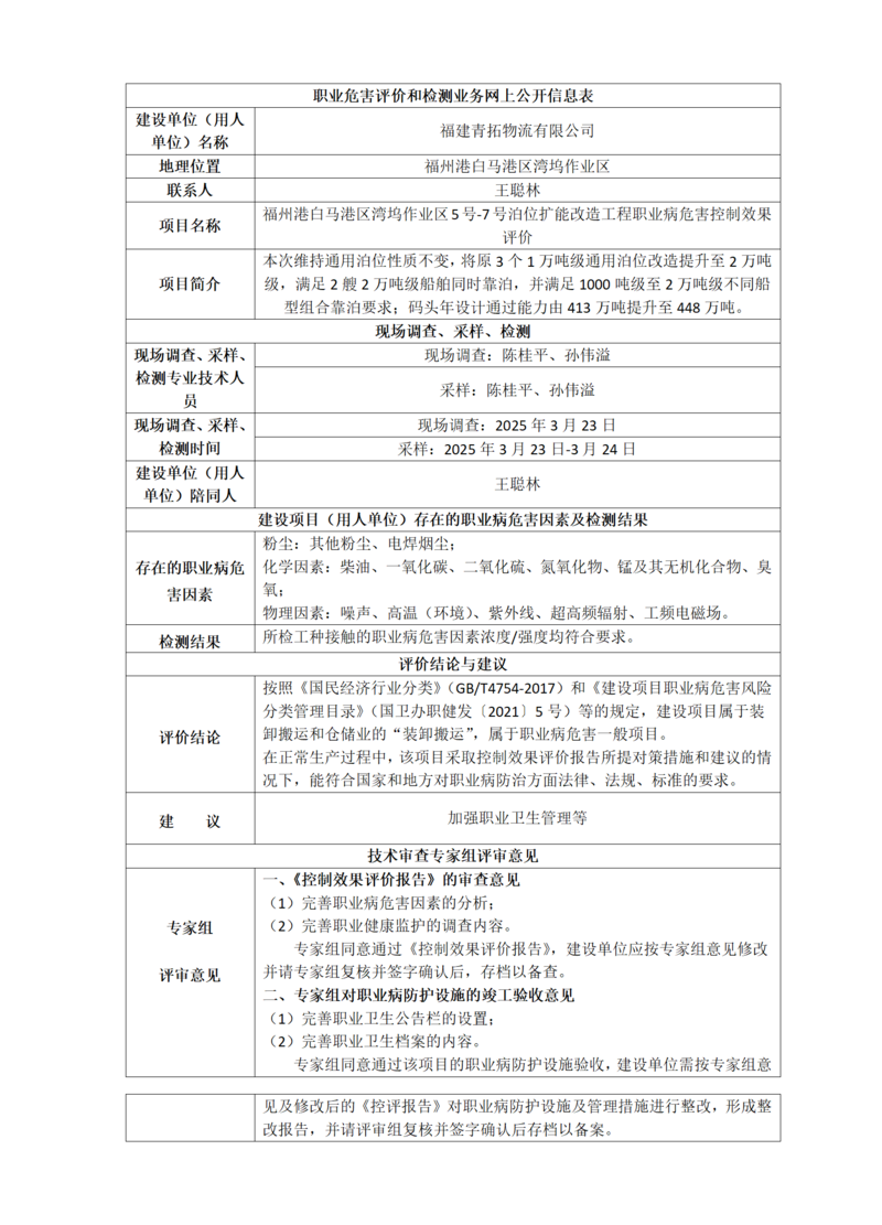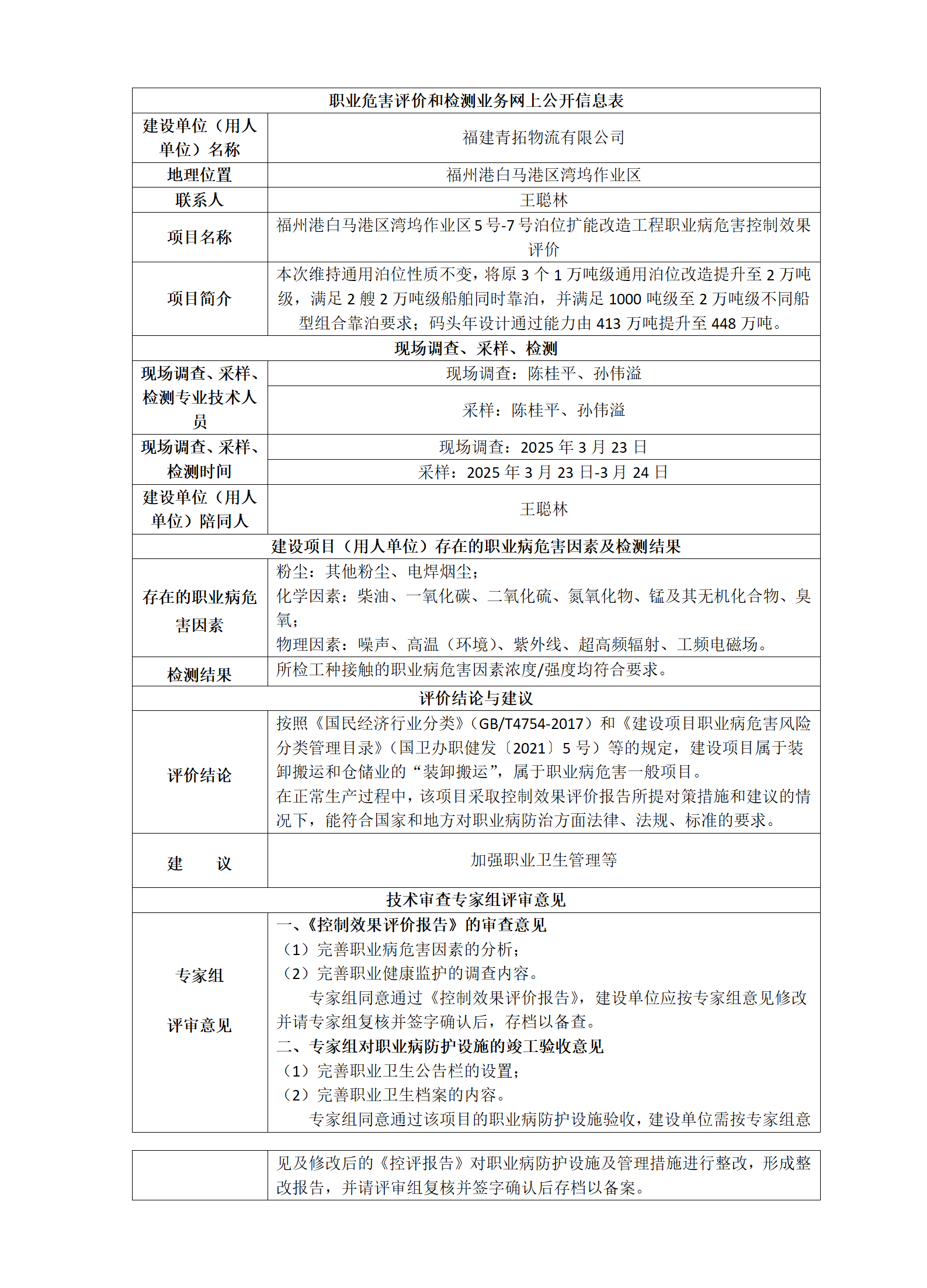 福州港白马港区湾坞作业区5号-7号泊位扩能改造工程职业病危害控制效果评价