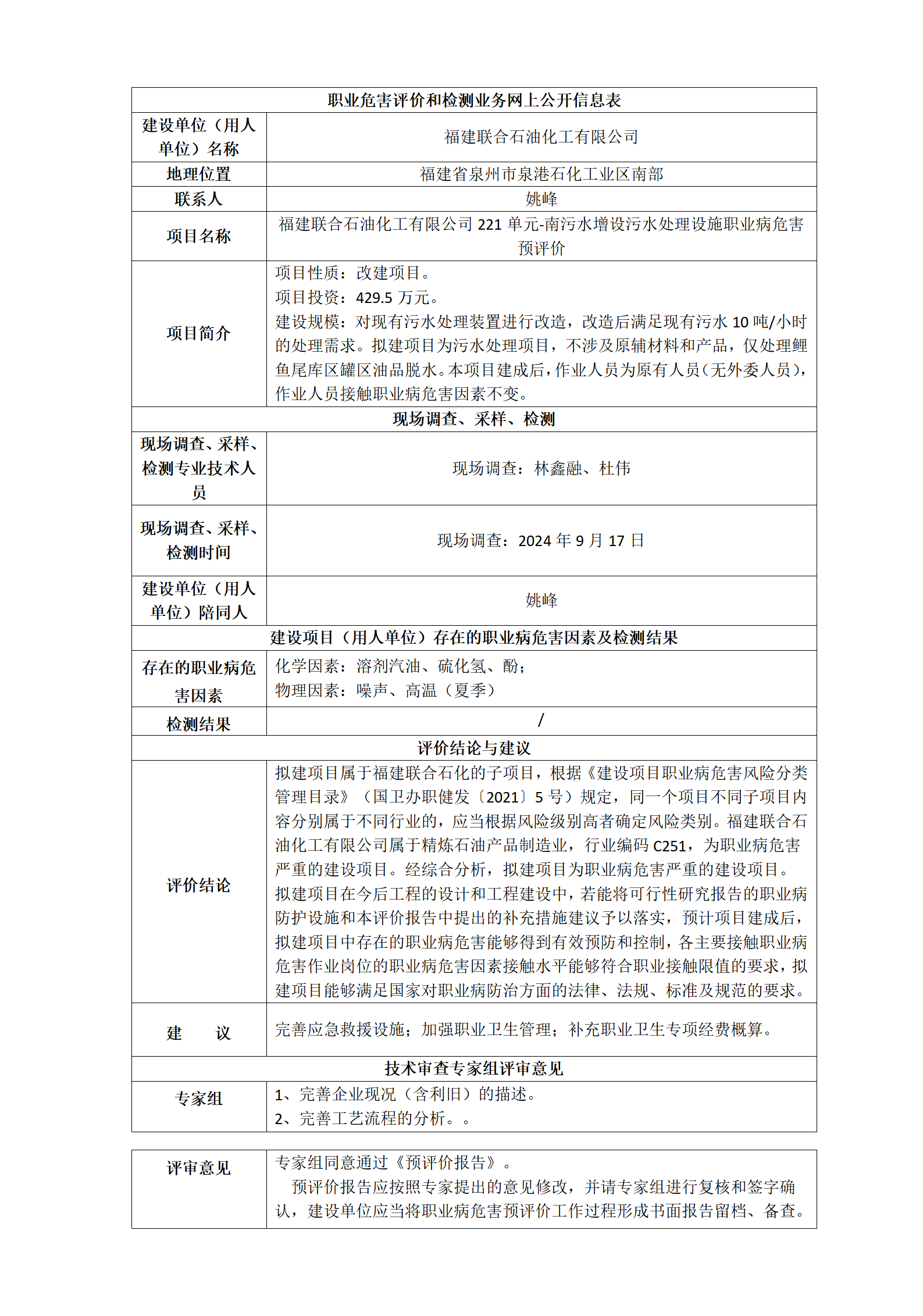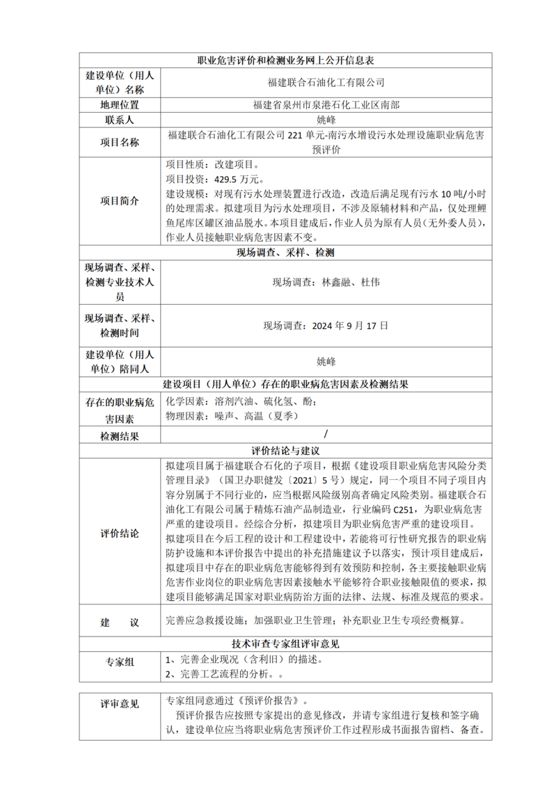 福建联合石油化工有限公司221单元-南污水增设污水处理设施职业病危害预评价
